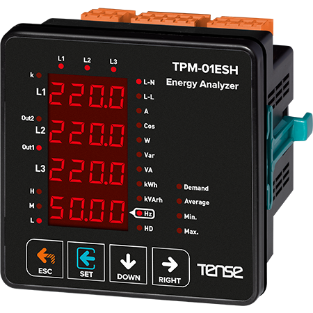 3-Phase Network Analyzer / Network Analyzer / Network Parameter Meter - Multifunctional digital panel meter, current, voltage, frequency and total power indicator, with two relay outputs and digital input, RS485 ModBus RTU - TPM-01ESH manufacturer TENSE (Turkey)