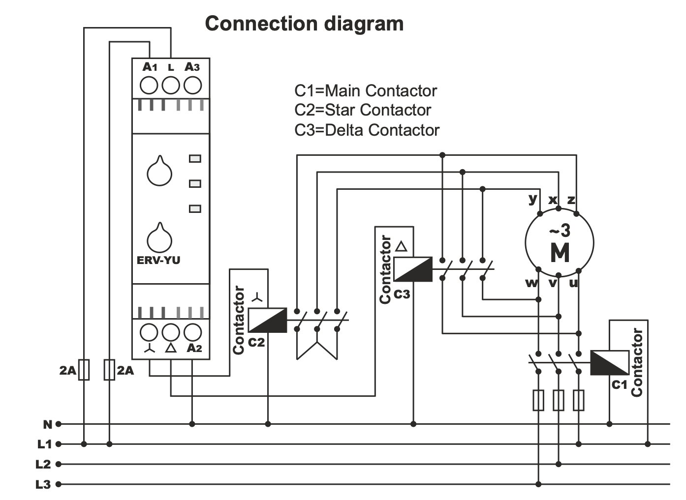 Automatic Star Triangle Switch - Star-Triangle Time Relays are designed for use for the initial start-up of three-phase motors. When the coil is energized, it will switch to star wiring to allow the motor to start. The star stays connected for a set period of time and then goes into standby mode. After the waiting period, it allows switching to delta connection. It therefore provides efficiency by reducing the current drawn by motors using high power during starting.