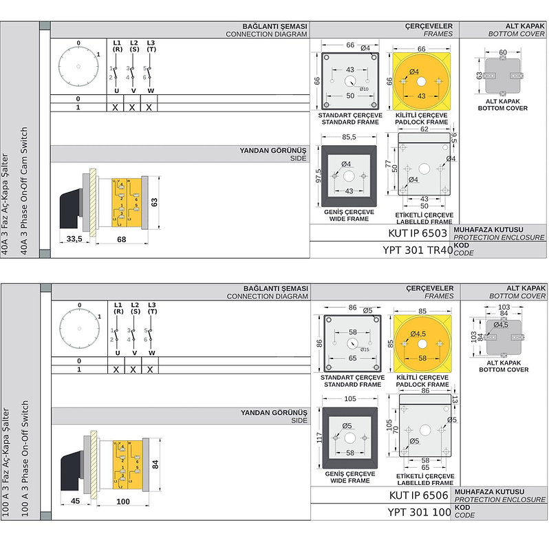 YKL101 / YKL201 / YKL301 / YKL401 OPAŞ two-position rotary cam switches that can be used as an emergency stop and can be locked in the OFF or ON position using a padlock (not supplied) or to be used just to connect / disconnect two electrical circuits. Two positions - one "OFF"/"0", one "ON"/"1", switching between - by rotary handle.